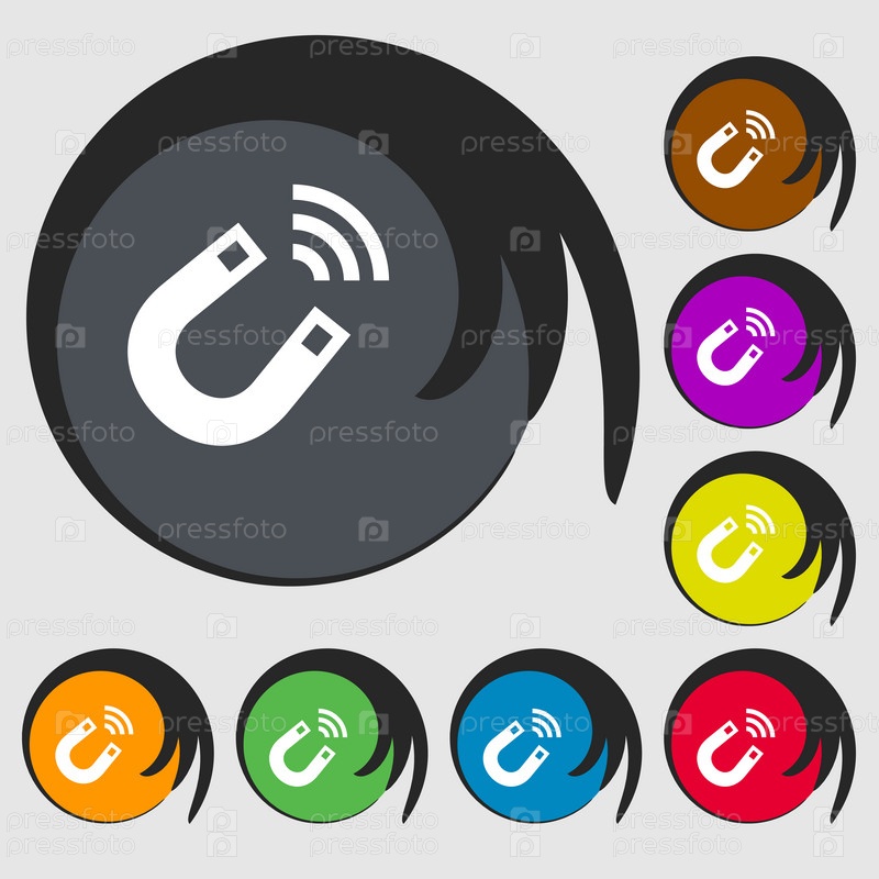 Магнит значок знак. Символ на восьми цветных кнопок. Вектор