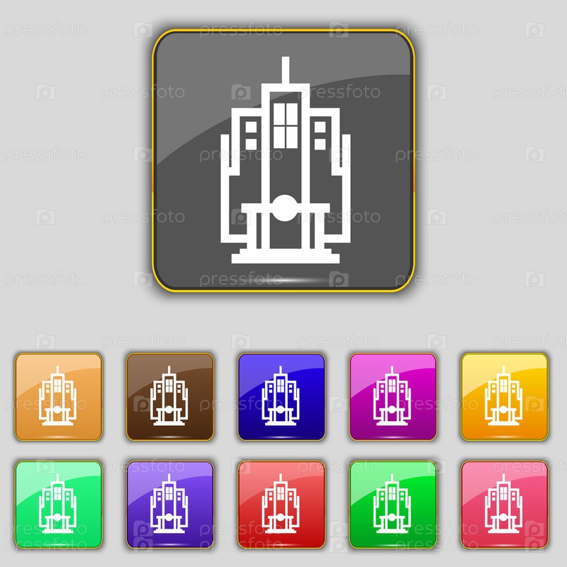 Небоскреб значок знак. Набор с одиннадцать цветные кнопки для вашего сайта. Вектор