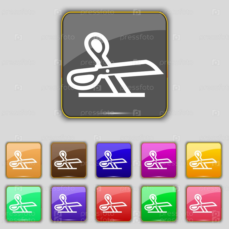 Ножницы значок знак. Набор с одиннадцать цветные кнопки для вашего сайта. Вектор