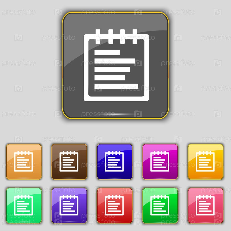 Блокнот значок знак. Набор с одиннадцать цветные кнопки для вашего сайта. Вектор