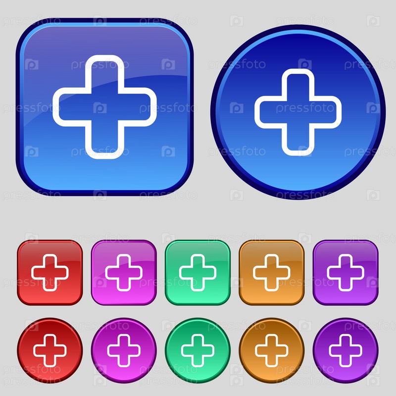 Плюс значок знак. Набор из двенадцати марочных кнопки для вашего дизайна. Вектор