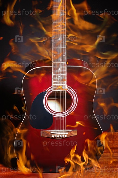 Акустическая гитара в языках пламени на черном фоне