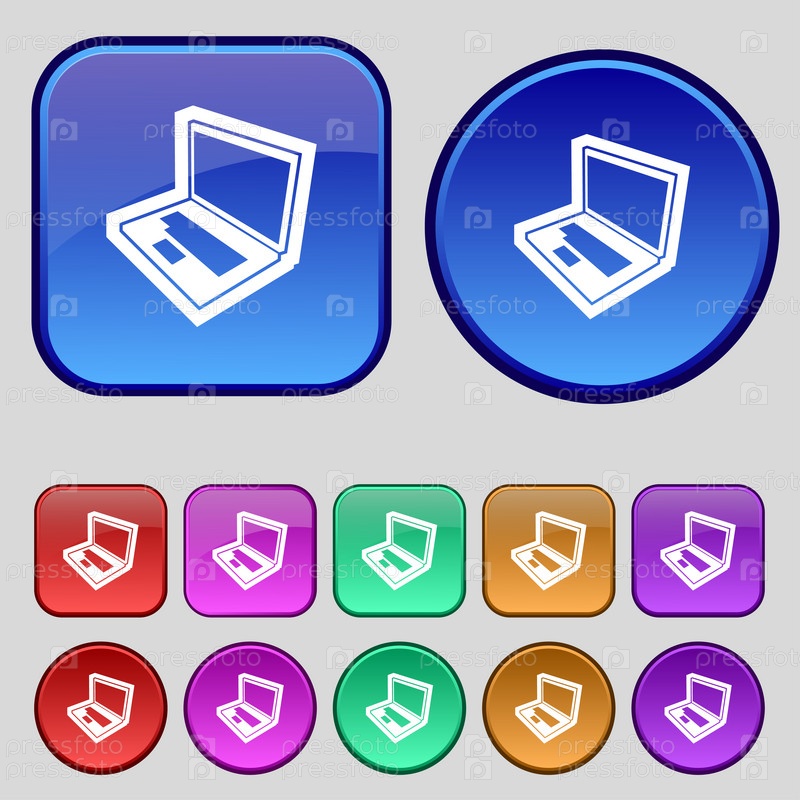 Ноутбук значок знак. Набор из двенадцати марочных кнопки для вашего дизайна. Вектор