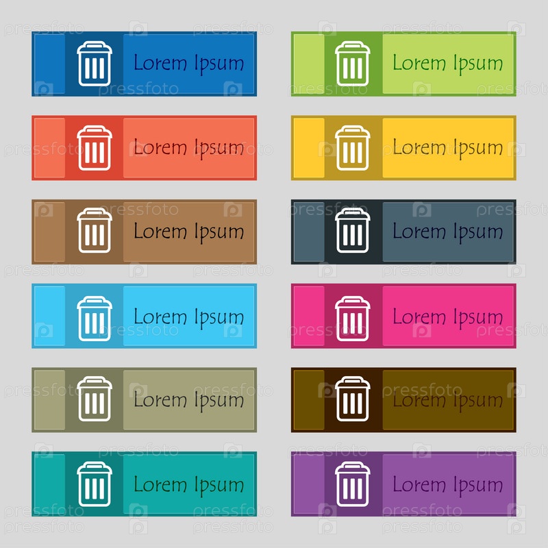 Знак значок корзины. Набор 12 прямоугольные, красочные, красивая, высокое качество кнопок для сайта. Вектор
