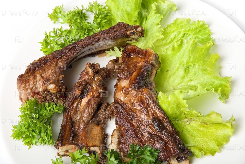 Мясо с зеленью на белом фоне
