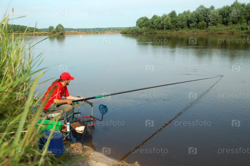 Рыбак в красной футболке и красной кепке удит рыбу на реке