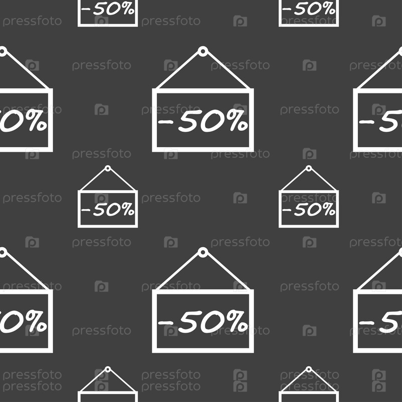 50 скидка значок знак. Бесшовный узор на сером фоне. Вектор
