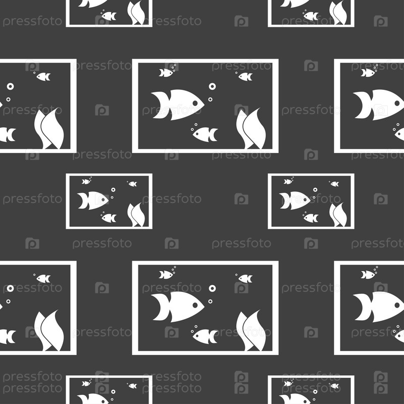 Аквариумы, рыбы в воде значок знак. Бесшовный узор на сером фоне. Вектор