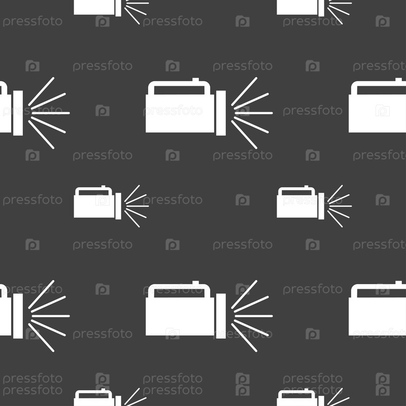 Фонарик значок знак. Бесшовный узор на сером фоне. Вектор