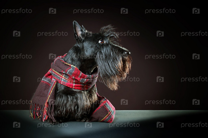 Шотландский терьер в красном шарфе на темном фоне