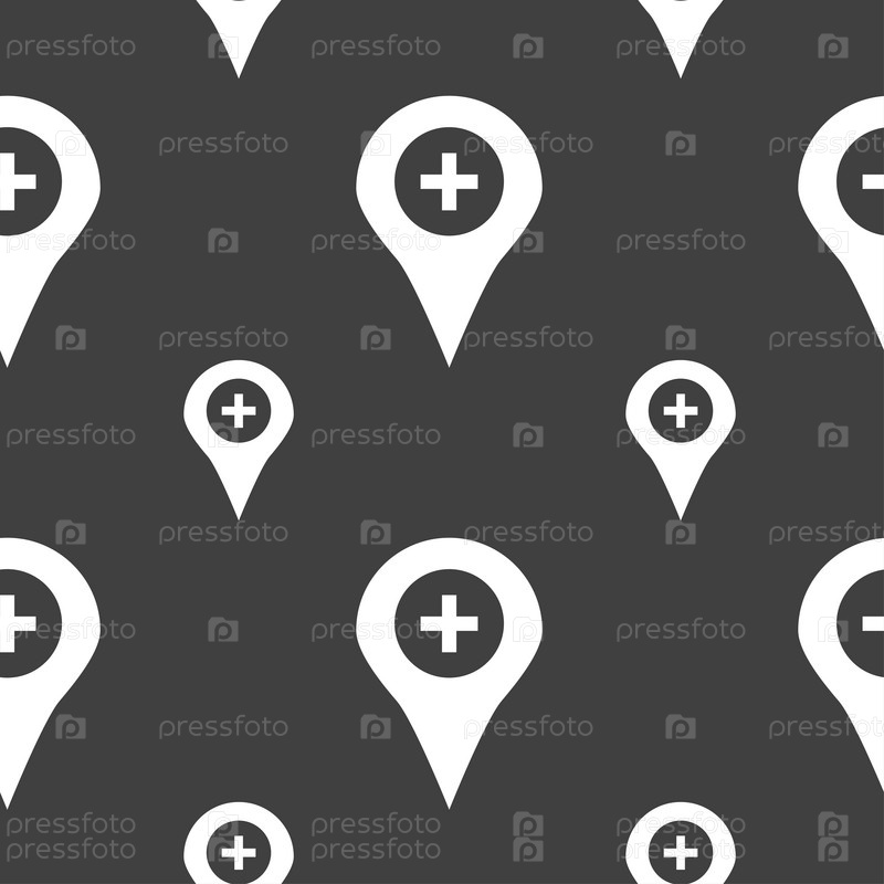 Плюс указатель карты, GPS местоположение иконка знак. Бесшовный узор на сером фоне. Вектор