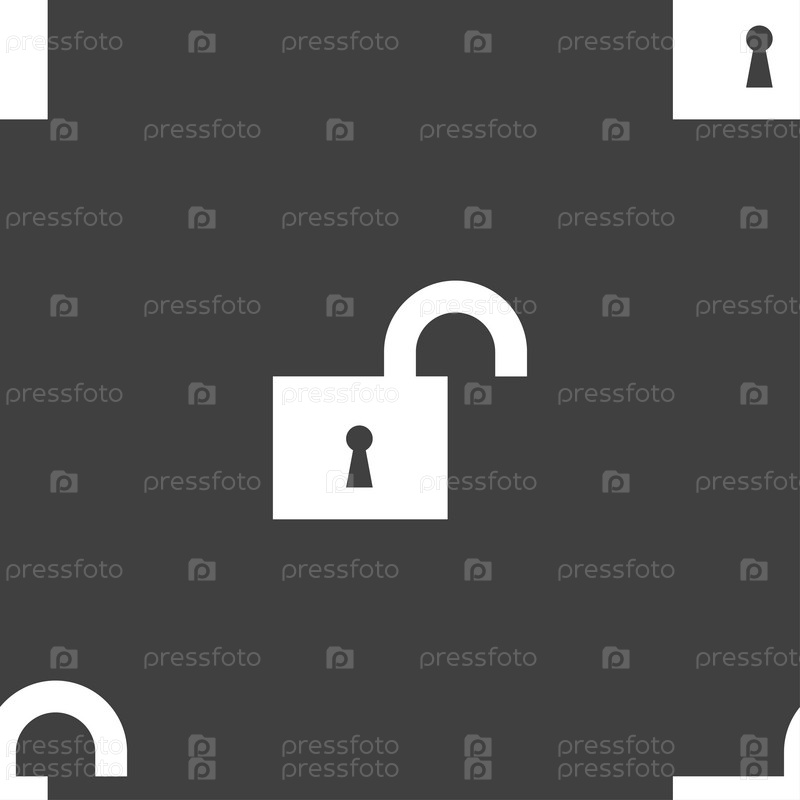 Открытый замок значок знак. Бесшовный узор на сером фоне. Вектор