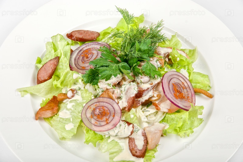 Зеленый салат с луком и колбасой в тарелке