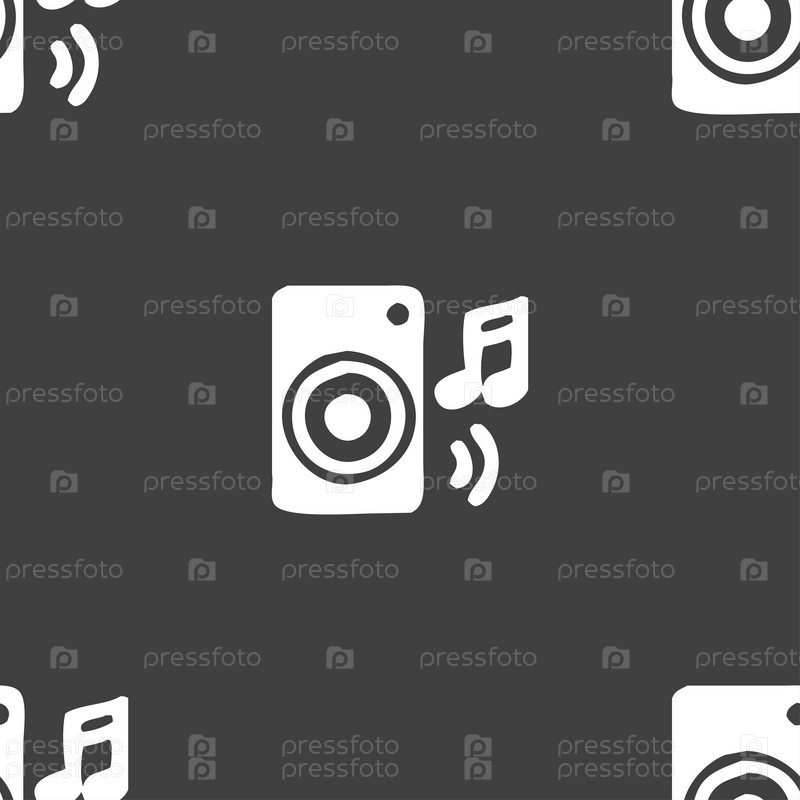 Музыкальные колонки, диско, музыка, мелодии, Спикер Иконка знак. Бесшовный узор на сером фоне. Вектор
