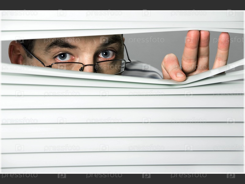 Близкий план венецианского слепого с мужчиной, смотрящим из него