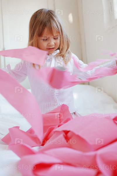 Маленькая девочка играет с розовой туалетной бумагой
