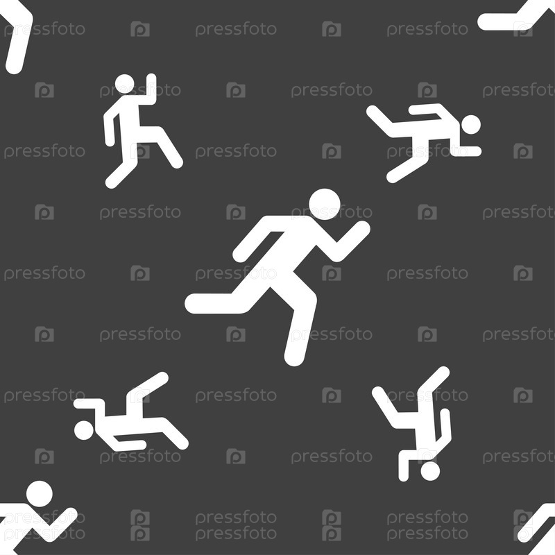 Бегущий человек значок знак. Бесшовный узор на сером фоне. Вектор