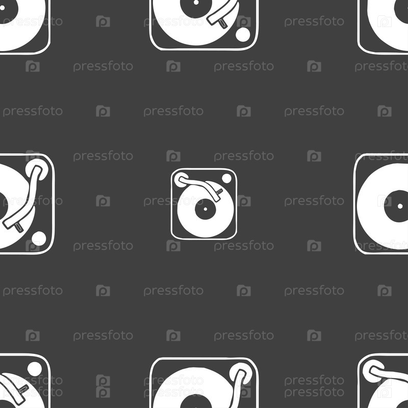 Граммофон, винил значок знак. Бесшовный узор на сером фоне. Вектор