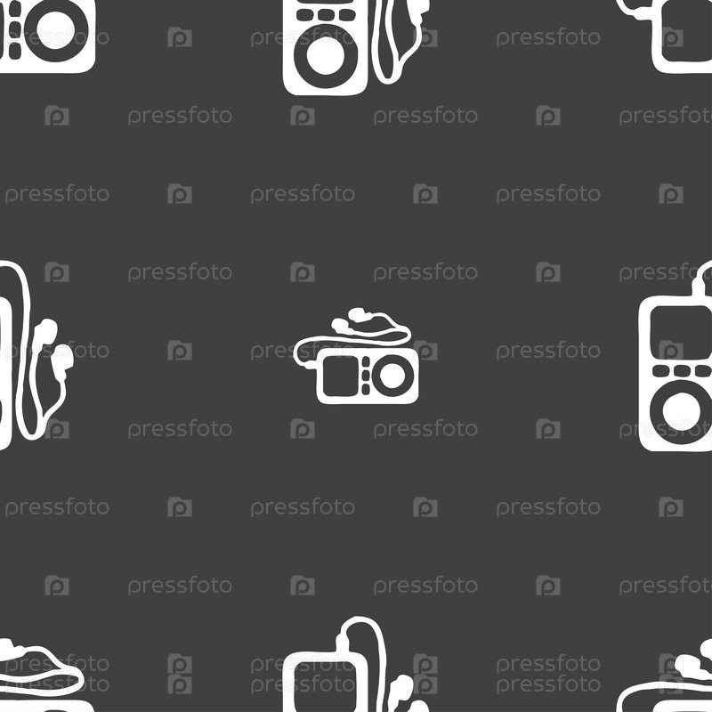 MP3-плеер, наушники, музыкальный значок знака. Бесшовный узор на сером фоне. вектор