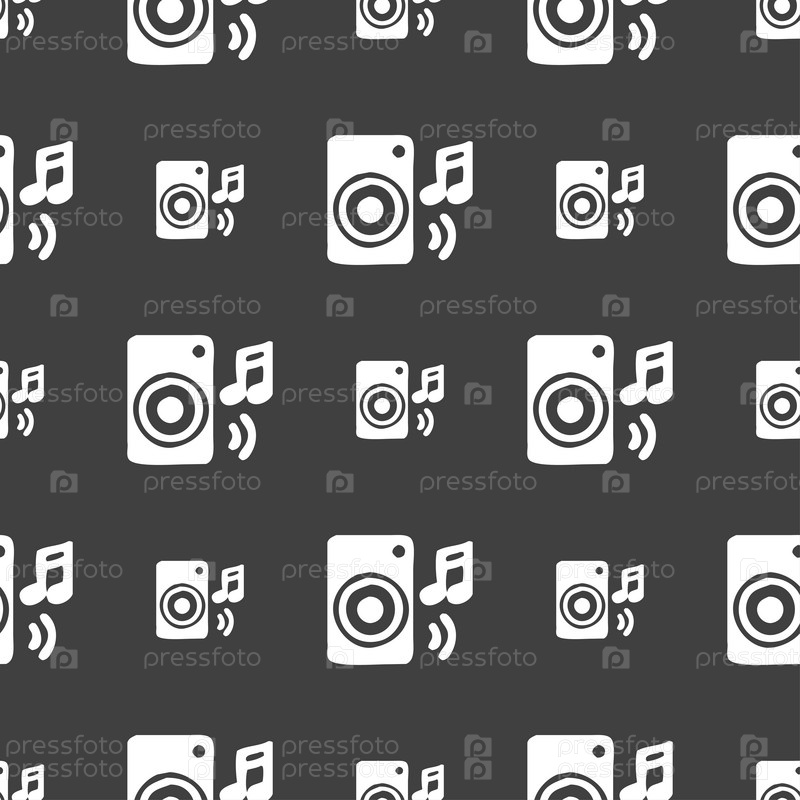 Музыкальные колонки, диско, музыка, мелодии, Спикер Иконка знак. Бесшовный узор на сером фоне. Вектор