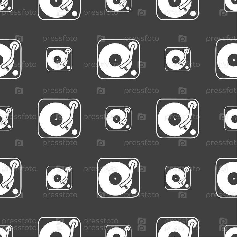 Граммофон, винил значок знак. Бесшовный узор на сером фоне. Вектор