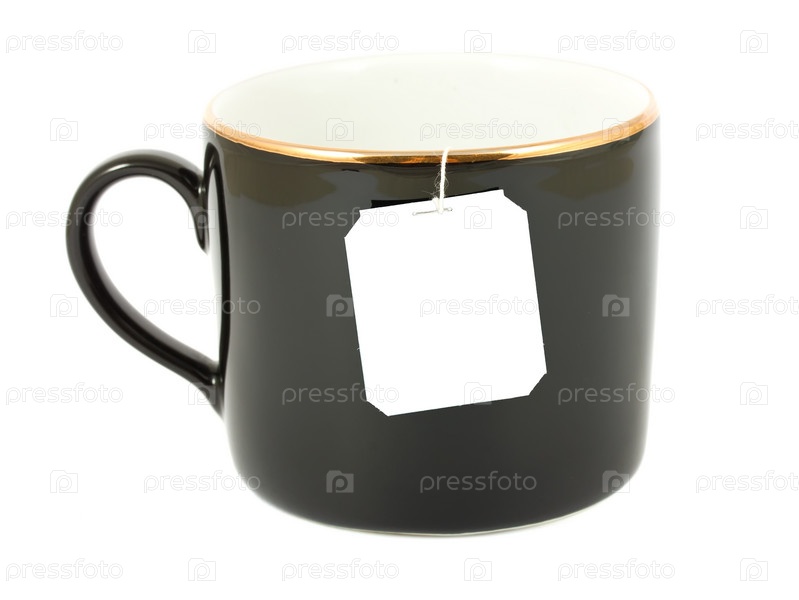 Кружка чая с пустой этикеткой, изолирована на белом фоне