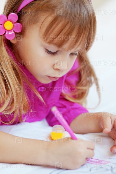 Маленькая девочка рисует, лежа на животе