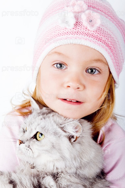Маленькая девочка с котенком на белом фоне