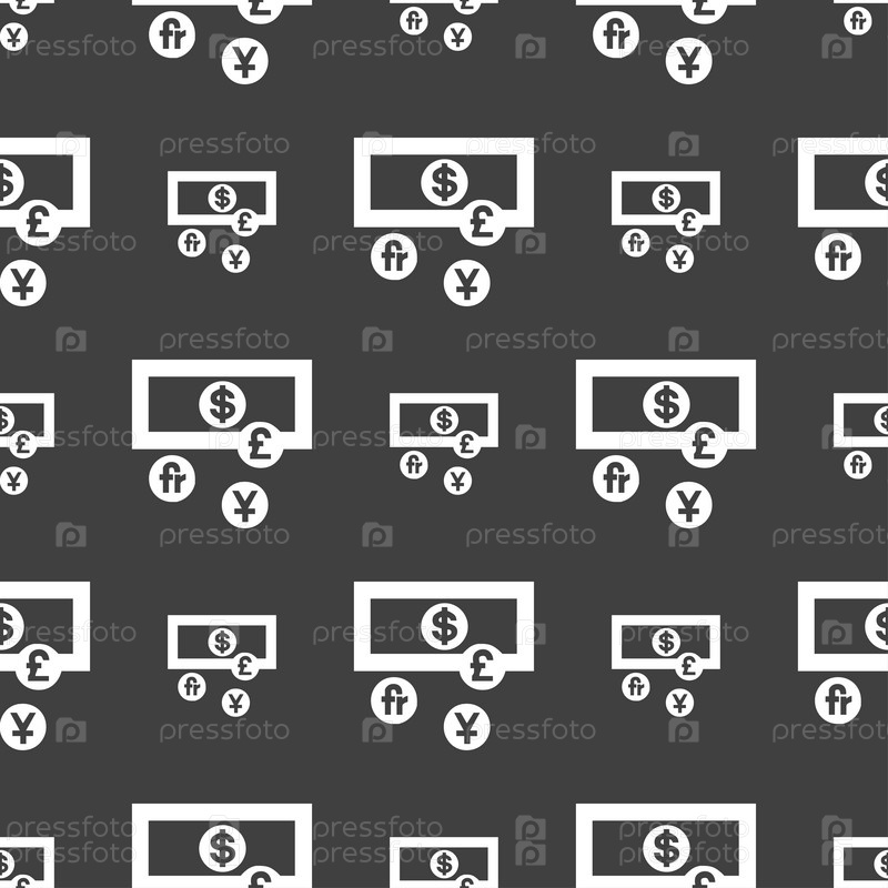 Валюты мира значок знак. Бесшовный узор на сером фоне. Вектор