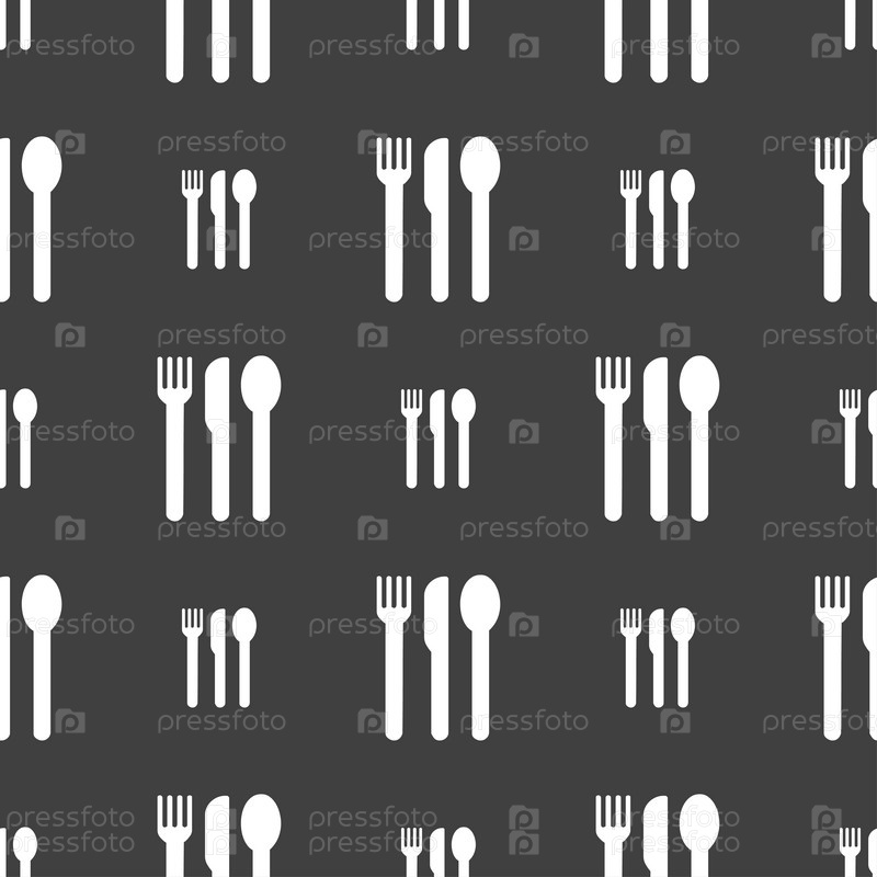 Вилка, нож, ложка значок знак. Бесшовный узор на сером фоне. Вектор