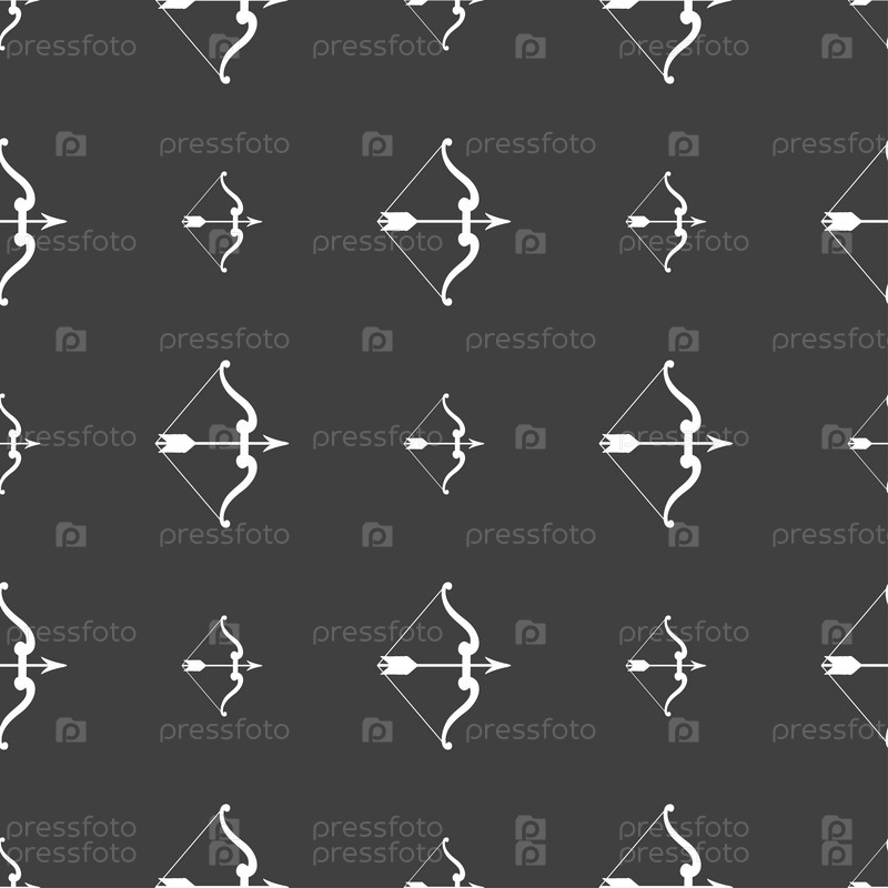Лук и стрелы значок знак. Бесшовный узор на сером фоне. Вектор