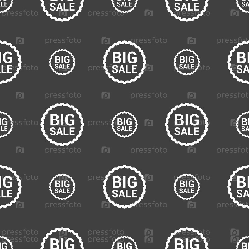 Большие продажи значок знак. Бесшовный узор на сером фоне. Вектор