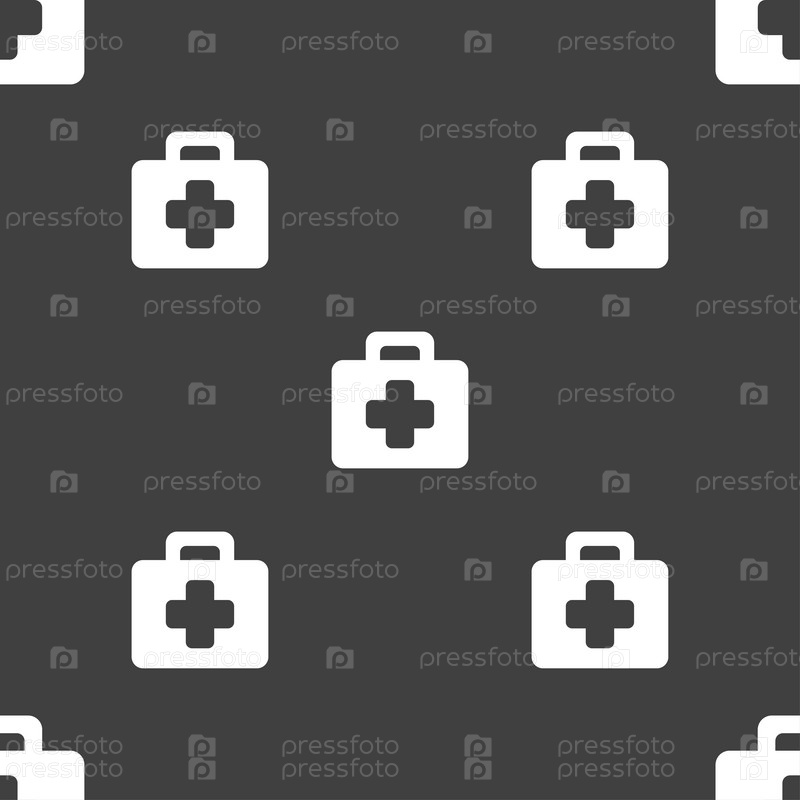 Комплект первой помощи значок знак. Бесшовный узор на сером фоне. Вектор