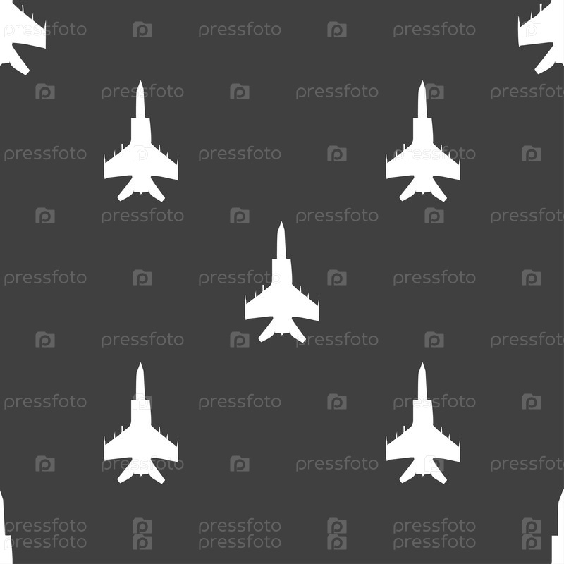 Истребитель значок знак. Бесшовный узор на сером фоне. Вектор