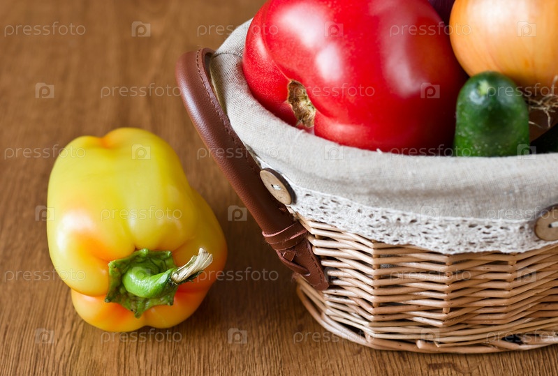 Свежие овощи в корзине на деревянном столе