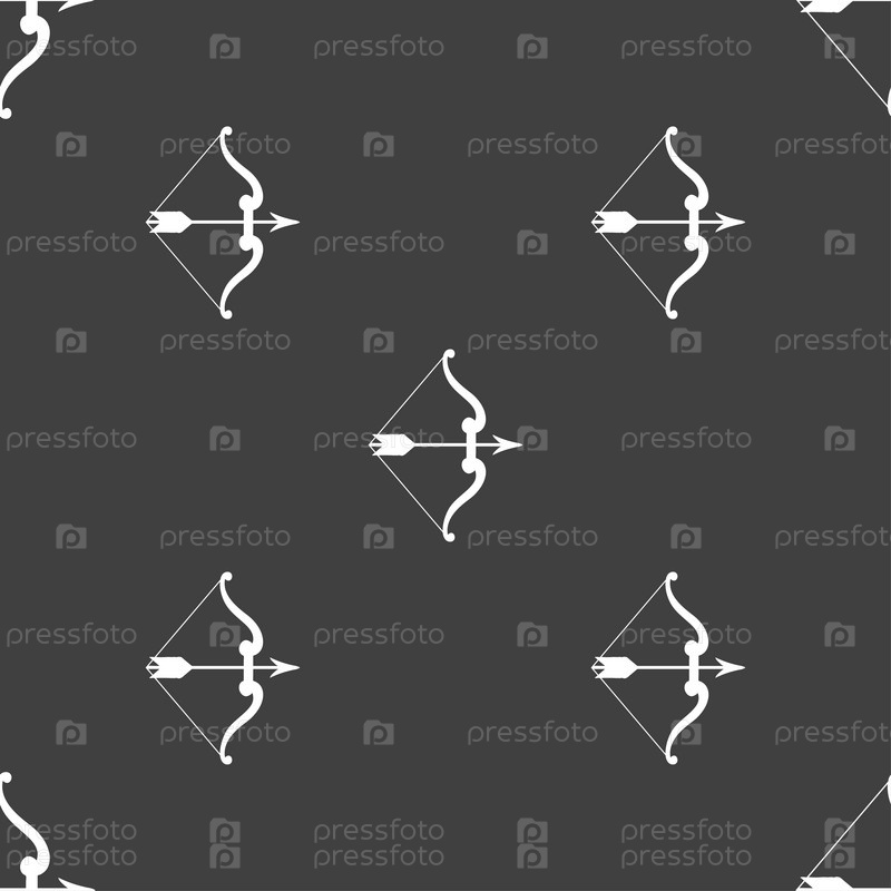 Лук и стрелы значок знак. Бесшовный узор на сером фоне. Вектор