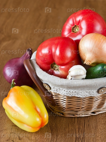 Свежие овощи в корзине на деревянном столе