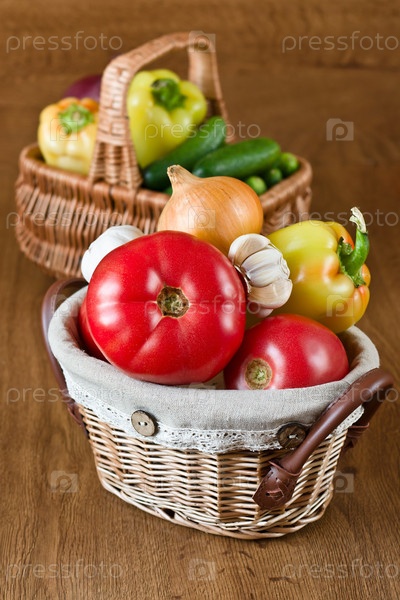 Урожай свежих овощей в корзине на деревянном столе