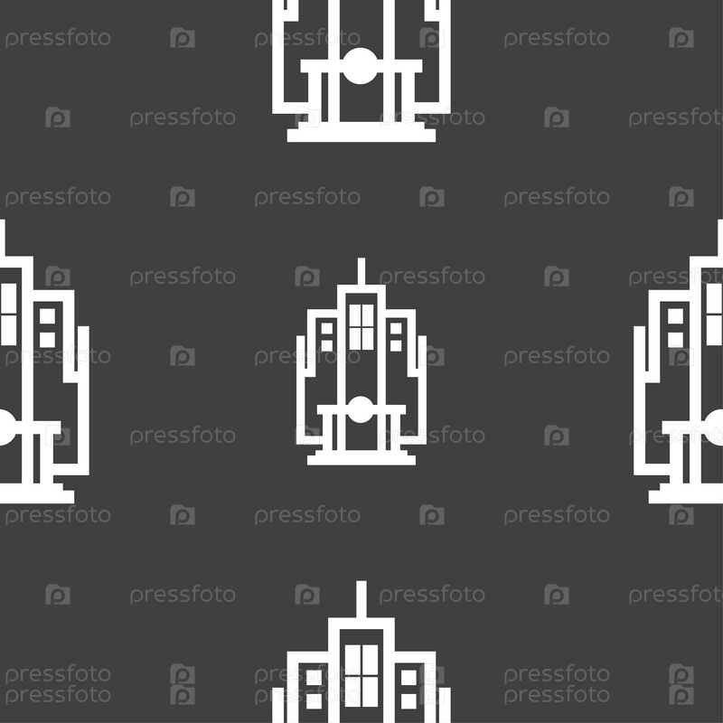 Небоскреб значок знак. Бесшовный узор на сером фоне. Вектор