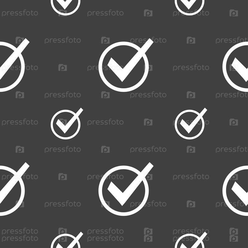 Флажок, тик значок знак. Бесшовный узор на сером фоне. Вектор