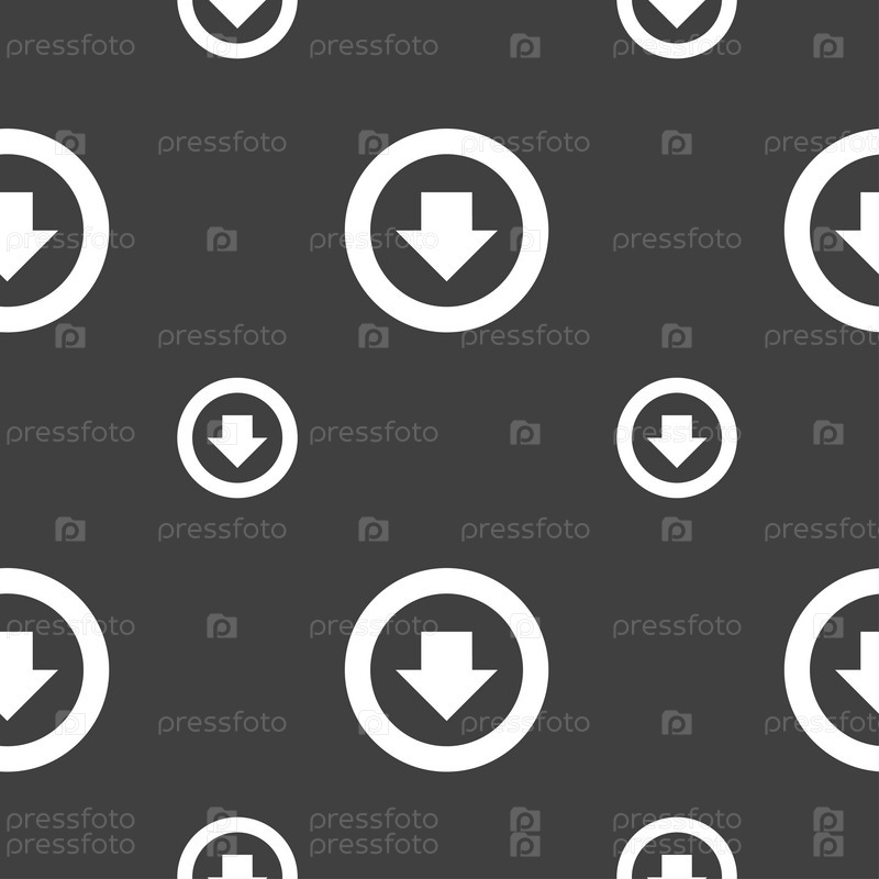 Стрелка вниз, скачать, загрузки, знак значок резервного копирования. Бесшовный узор на сером фоне. Вектор