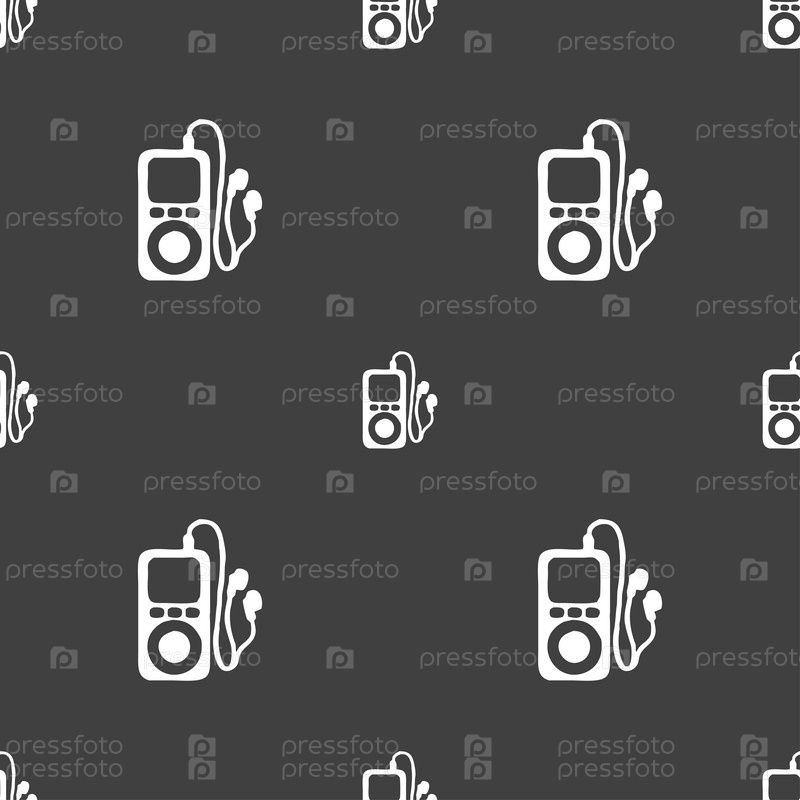 MP3-плеер, наушники, музыкальный значок знака. Бесшовный узор на сером фоне. вектор