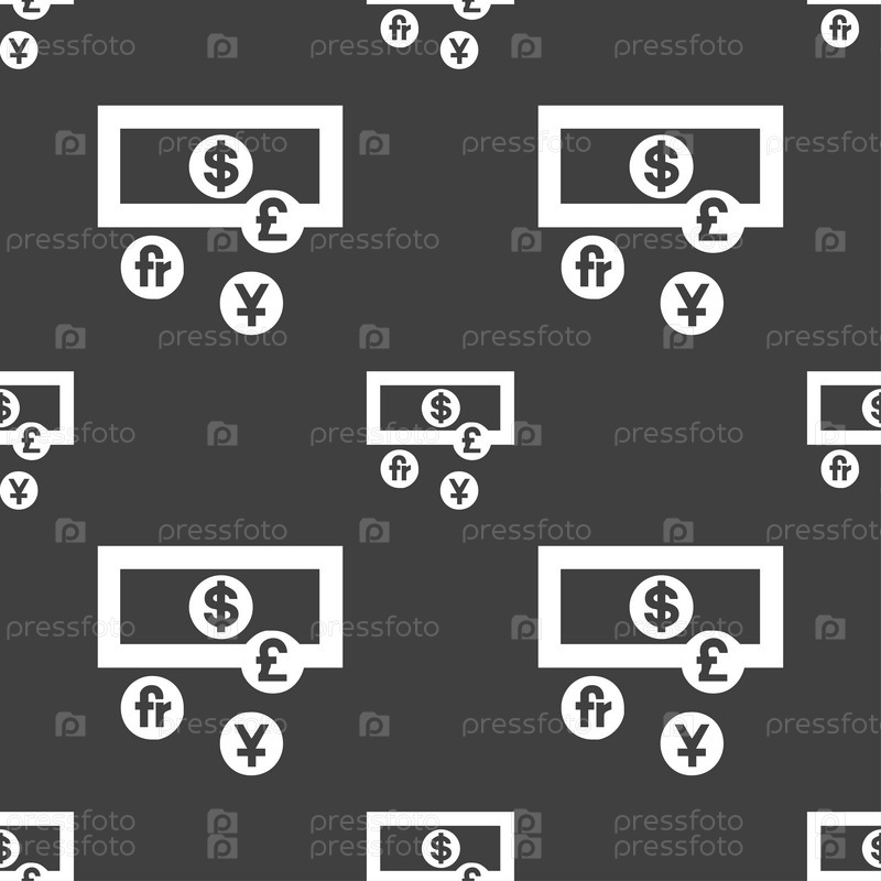 Валюты мира значок знак. Бесшовный узор на сером фоне. Вектор