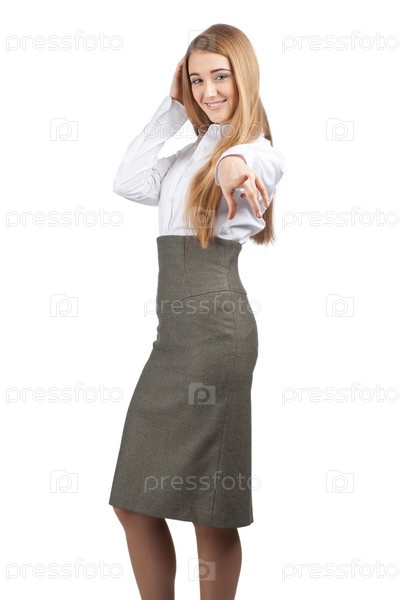 Портрет привлекательной бизнес-леди, указывающей пальцем на зрителя, изолировано на белом