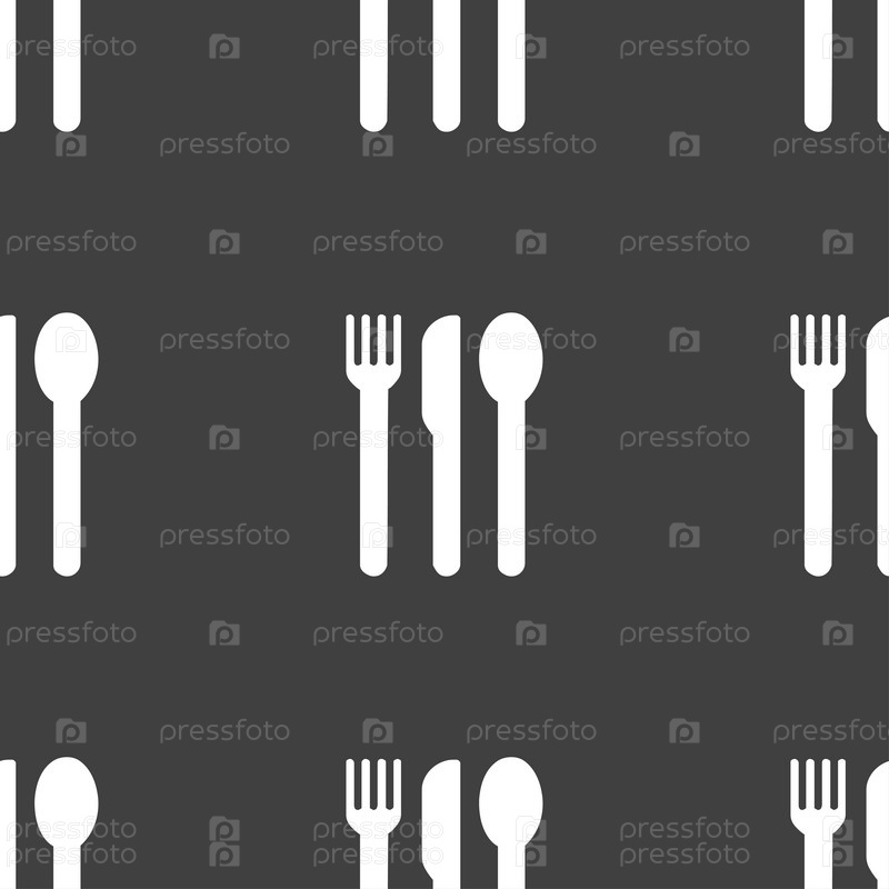Вилка, нож, ложка значок знак. Бесшовный узор на сером фоне. Вектор