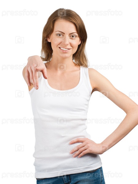 Портрет привлекательной улыбающейся девушки в белой майке, указывающей пальцем на зрителя, изолировано на белом