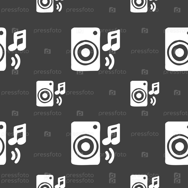 Музыкальные колонки, диско, музыка, мелодии, Спикер Иконка знак. Бесшовный узор на сером фоне. Вектор