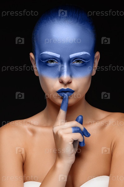 Портрет женщины, которая позирует покрыта синей краской