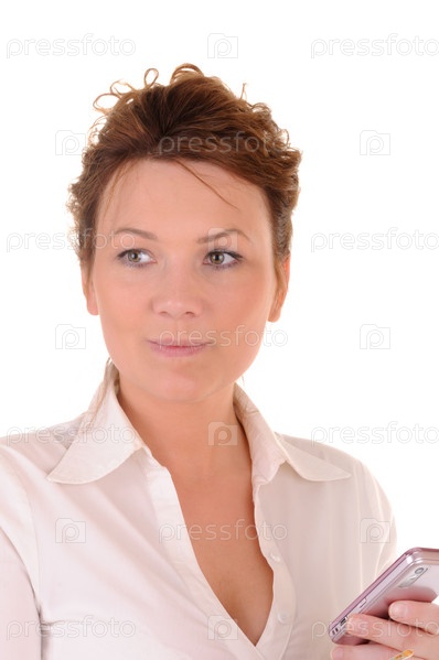 Деловая женщина с мобильным телефоном в руке на белом фоне
