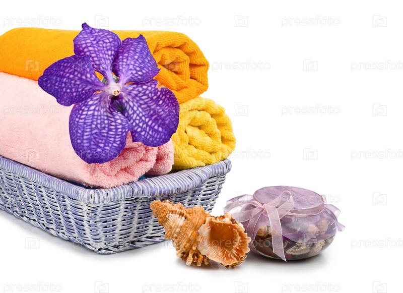 Полотенца, ракушка и цветок орхидеи на белом фоне